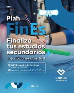 Lanús Gobierno informó que comenzaron las inscripciones para la nueva edición del Plan de Finalización de Estudios Secundarios (FinES), en el Centro de Atención Vecinal (CAV), ubicado en Albarracín N° 2389, en la localidad de Remedios de Escalada, de lunes a viernes de 7:30 a 13:30.