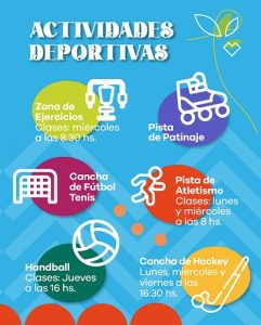 Dentro de las propuestas deportivas se brindan clases en la pista de skate los martes y jueves a partir de las 16; de fútbol los martes y jueves a las 18:30; de básquet los lunes, miércoles y viernes a las 16; de vóley playa los lunes, miércoles y viernes a las 17; de atletismo en pista los lunes y miércoles a las 8; de hockey los lunes, miércoles y viernes a las 16:30; de ajedrez a las 15:30; de quadskate los miércoles a las 18 y los sábados a las 10:30; de handball los jueves a las 16; y habrá una zona de ejercicios los miércoles a las 8:30.