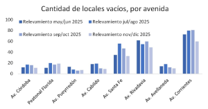 En el bimestre noviembre-diciembre de 2025, la cantidad de locales vacíos mostró un aumento del 26,9% en relación al mismo período de 2024. Comparado con septiembre-octubre de 2025, hubo una baja del 20,5%.