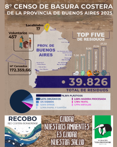 Durante los meses de septiembre y octubre de 2025 se llevó a cabo la 8va. edición del Censo Provincial de Basura Costera Marina, organizado por la Red Costera Bonaerense (RECOBO), una articulación de organizaciones de la sociedad civil y organismos locales de las principales ciudades costeras de la Provincia de Buenos Aires, con la participación activa de 457 voluntarios.
