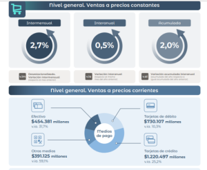 Por su parte, las efectuadas mediante tarjeta de débito fueron de 730.106.899 miles de pesos, lo que representa el 26,1% de las ventas totales y una variación positiva de 10,3% respecto al mismo mes del año anterior.