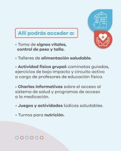 Quienes se acerquen también tendrán la posibilidad de participar de charlas informativas vinculadas al sistema de salud y a los programas de provisión de medicamentos. Asimismo, habrá juegos y propuestas recreativas para todas las edades, y se otorgarán turnos para atención nutricional. (VW)
